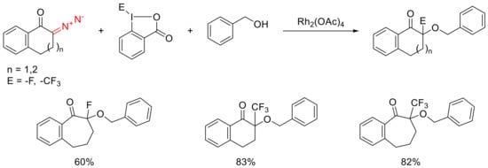 - Yuan, W.; Eriksson, L.; Szabó, K.J. Rhodium-Catalyzed Geminal Oxyfluorination and Oxytrifluoro-Methylation of Diazocarbonyl Compounds. Angew. Chem. Int. Ed. 2016, 55, 8410–8415. [Google Scholar] [CrossRef]