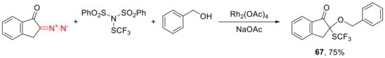 - Lübcke, M.; Yuan, W.; Szabó, K.J. Trifluoromethylthiolation-Based Bifunctionalization of Diazocarbonyl Compounds by Rhodium Catalysis. Org. Lett. 2017, 19, 4548–4551. [Google Scholar] [CrossRef]