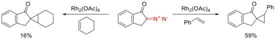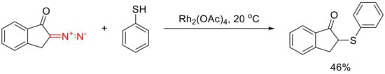 - Rosenfeld, M.J.; Shankar, B.K.R.; Shechter, H. Rhodium(II) Acetate-Catalyzed Reactions of 2-Diazo-1,3-Indandione and 2-Diazo-1-Indanone with Various Substrates. J. Org. Chem. 1988, 53, 2699–2705. [Google Scholar] [CrossRef]