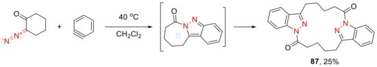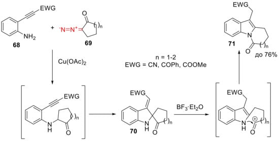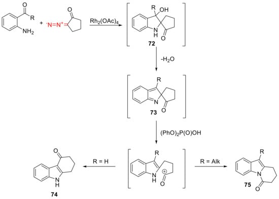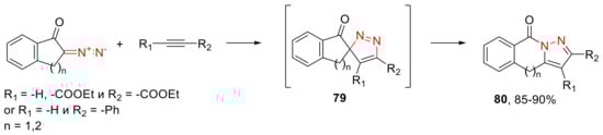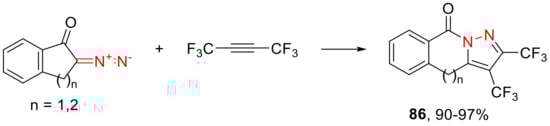 - Yamazaki, T.; Shechter, H. Rearrangement, Extrusion, and Polymerization Reactions upon Addition of Acetylenes to 3-Diazooxindole and Six-Membered Ring α-Diazo Ketones. Tetrahedron Lett. 1973, 14, 1417–1420. [Google Scholar] [CrossRef]