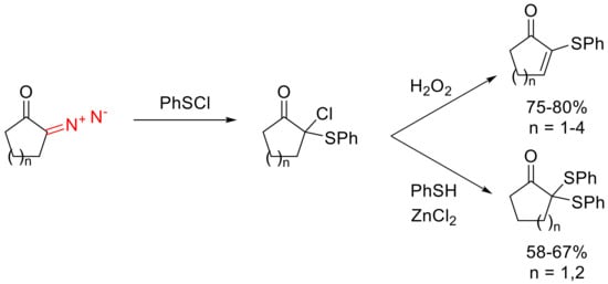 - McKervey, M.A.; Ratananukul, P. Regiospecific Synthesis of α-(Phenylthio)Cycloalkenones and of α-Phenyl-α-(Phenylthio) Ketones via aα-Addition of Phenylsulphenyl Chloride to a-Diazoketones. Tetrahedron Lett. 1983, 24, 117–120. [Google Scholar] [CrossRef]