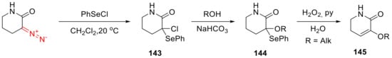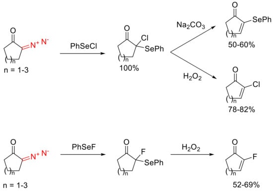 - Buckley, D.J.; Kulkowit, S.; McKervey, A. Reactions of α-Diazoketones with Phenylselenenyl Chloride. A New Synthesis of α-Chloro- and α-Phenylselenenyl-Aβ-Unsaturated Ketones. J. Chem. Soc. Chem. Commun. 1980, 506–507. [Google Scholar] [CrossRef]