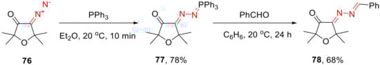 - Rodina, L.L.; Galiullina, S.V.; Matyushina, N.V.; Nikolaev, V.A. Staudinger Reaction in the Series of 4-Diazotetrahydrofuran-3-Ones: Effect of Substituents in the Diazo and Phosphine Components. Russ. J. Org. Chem. 2007, 43, 1882–1885. [Google Scholar] [CrossRef]