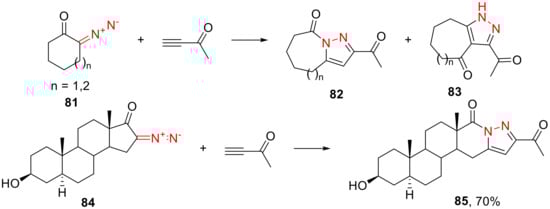 - Vuluga, D.; Legros, J.; Crousse, B.; Bonnet-Delpon, D. Synthesis of Pyrazoles through Catalyst-Free Cycloaddition of Diazo Compounds to Alkynes. Green Chem. 2009, 11, 156–159. [Google Scholar] [CrossRef]