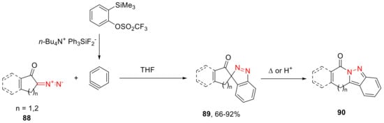 - Cheng, B.; Bao, B.; Zu, B.; Duan, X.; Duan, S.; Li, Y.; Zhai, H. Synthesis of Spiro-3 H-Indazoles via 1,3-Dipolar Cycloaddition of Arynes with 6-Diazocyclohex-2-En-1-One Derivatives and Fused-2 H-Indazoles by Subsequent Rearrangement. RSC Adv. 2017, 7, 54087–54090. [Google Scholar] [CrossRef]