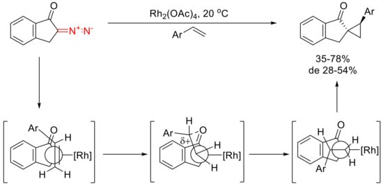 - Bauta, W.; Dodd, J.; Bullington, J.; Gauthier, D.; Leo, G.; McDonnell, P. Stereoselectivity in the Rhodium(II) Acetate Catalysed Cyclopropanations of 2-Diazo-1-Indanone with Styrenes. Tetrahedron Lett. 2000, 41, 1491–1494. [Google Scholar] [CrossRef]