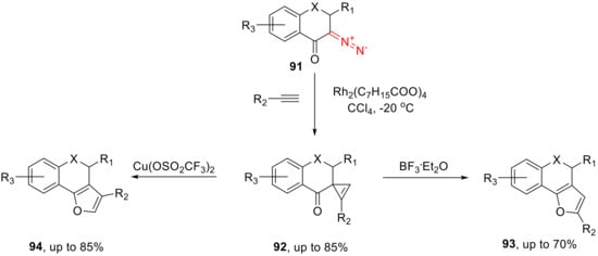 - Gong, J.; Zhao, Z.; Zhang, F.; Wu, S.; Yan, G.; Quan, Y.; Ma, B. One-Pot Novel Regioselective Cycloisomerization Synthesis of 2-Substituted or 3-Substituted 4H-Furo[3,2-c]Chromene through the Intermediate Cyclopropenes of 3-Diazochroman-4-One and Phenylacetylene. Org. Lett. 2014, 16, 5524–5527. [Google Scholar] [CrossRef]