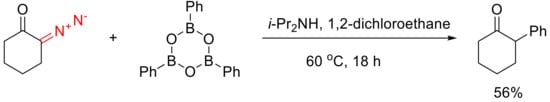 - Peng, C.; Zhang, W.; Yan, G.; Wang, J. Arylation and Vinylation of α-Diazocarbonyl Compounds with Boroxines. Org. Lett. 2009, 11, 1667–1670. [Google Scholar] [CrossRef]