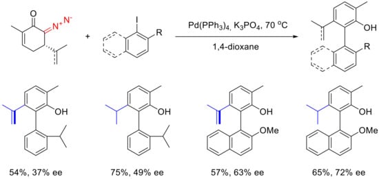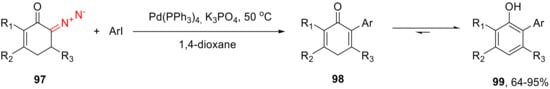 - Yang, K.; Zhang, J.; Li, Y.; Cheng, B.; Zhao, L.; Zhai, H. Facile Synthesis of 2-Arylphenols via Palladium-Catalyzed Cross-Coupling of Aryl Iodides with 6-Diazo-2-Cyclohexenones. Org. Lett. 2013, 15, 808–811. [Google Scholar] [CrossRef] [PubMed]