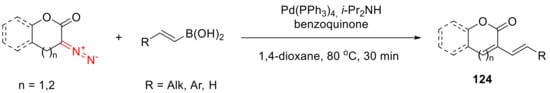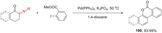 - Peng, C.; Yan, G.; Wang, Y.; Jiang, Y.; Zhang, Y.; Wang, J. Palladium-Catalyzed Coupling Reaction of α-Diazocarbonyl Compounds with Aromatic Boronic Acids or Halides. Synthesis 2010, 4154–4168. [Google Scholar] [CrossRef]