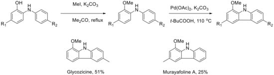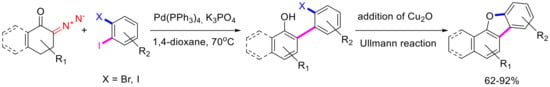 - Zhao, H.; Yang, K.; Zheng, H.; Ding, R.; Yin, F.; Wang, N.; Li, Y.; Cheng, B.; Wang, H.; Zhai, H. A One-Pot Synthesis of Dibenzofurans from 6-Diazo-2-Cyclohexenones. Org. Lett. 2015, 17, 5744–5747. [Google Scholar] [CrossRef] [PubMed]