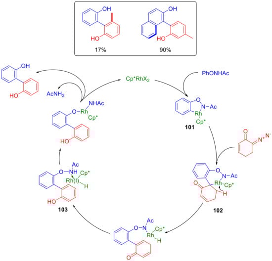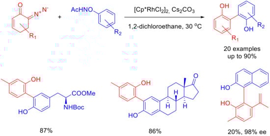 - Hu, Z.; Liu, G. Rhodium(III)-Catalyzed Cascade Redox-Neutral C-H Functionalization and Aromatization: Synthesis of Unsymmetrical Ortho-Biphenols. Adv. Synth. Catal. 2017, 359, 1643–1648. [Google Scholar] [CrossRef]
