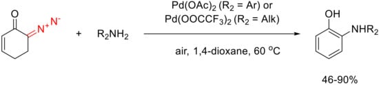 - Ding, D.; Lv, X.; Li, J.; Qiu, L.; Xu, G.; Sun, J. A Pd-Catalyzed Cascade Reaction of N–H Insertion and Oxidative Dehydrogenative Aromatization: A New Entry to 2-Amino-Phenols. Org. Biomol. Chem. 2014, 12, 4084–4088. [Google Scholar] [CrossRef]