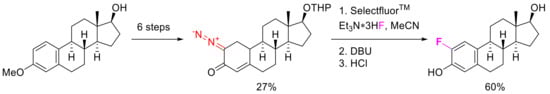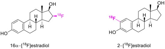 - Hostetler, E.D.; Jonson, S.D.; Welch, M.J.; Katzenellenbogen, J.A. Synthesis of 2-[18F]Fluoroestradiol, a Potential Diagnostic Imaging Agent for Breast Cancer: Strategies to Achieve Nucleophilic Substitution of an Electron-Rich Aromatic Ring with [8F]F−. J. Org. Chem. 1999, 64, 178–185. [Google Scholar] [CrossRef]