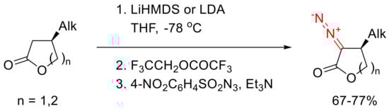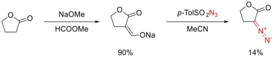 - Schmitz, A.; Kraatz, U.; Korte, F. Über die Synthese und Reaktivität von α-Diazo-γ-butyrolacton. Chem. Ber. 1975, 108, 1010–1016. [Google Scholar] [CrossRef]