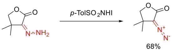 - Nicolle, S.M.; Moody, C.J. Potassium N -Iodo p -Toluenesulfonamide (TsNIK, Iodamine-T): A New Reagent for the Oxidation of Hydrazones to Diazo Compounds. Chem. Eur. J. 2014, 20, 4420–4425. [Google Scholar] [CrossRef] [PubMed]