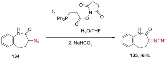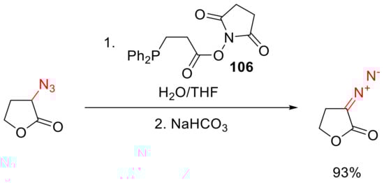 - Myers, E.L.; Raines, R.T. A Phosphine-Mediated Conversion of Azides into Diazo Compounds. Angew. Chem. Int. Ed. 2009, 48, 2359–2363. [Google Scholar] [CrossRef]