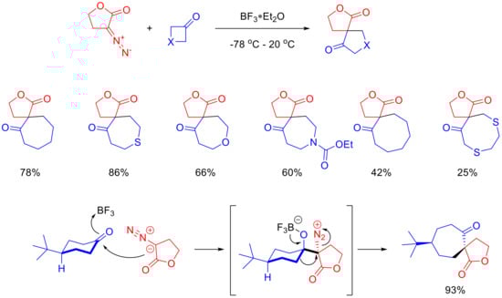 - Shershnev, I.; Dar’in, D.; Chuprun, S.; Kantin, G.; Bakulina, O.; Krasavin, M. The Use of ∝-Diazo-γ-Butyrolactone in the Büchner-Curtius-Schlotterbeck Reaction of Cyclic Ketones: A Facile Entry into Spirocyclic Scaffolds. Tetrahedron Lett. 2019, 60, 1800–1802. [Google Scholar] [CrossRef]