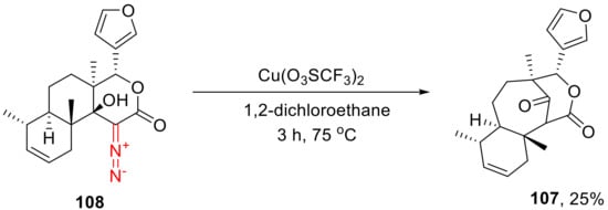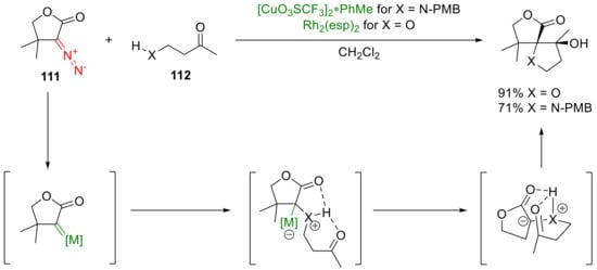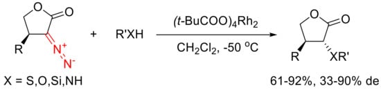 - Nicolle, S.M.; Lewis, W.; Hayes, C.J.; Moody, C.J. Stereoselective Synthesis of Highly Substituted Tetrahydrofurans through Diverted Carbene O-H Insertion Reaction. Angew. Chem. Int. Ed. 2015, 54, 8485–8489. [Google Scholar] [CrossRef] [PubMed]