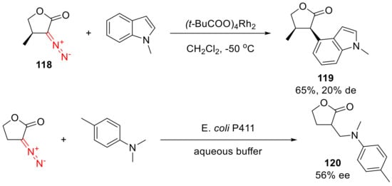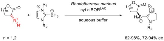 - Chen, K.; Huang, X.; Zhang, S.-Q.; Zhou, A.; Kan, S.B.J.; Hong, X.; Arnold, F. Engineered Cytochrome C-Catalyzed Lactone-Carbene B–H Insertion. Synlett 2019, 30, 378–382. [Google Scholar] [CrossRef]