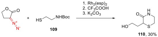 - Solovyov, I.; Dar’in, D.; Krasavin, M. Convenient Approach to 2-Substituted (Thio)Morpholin-3-Ones from α-Diazoacetates via X-H Carbene Insertion—Lactamization Sequence: Convenient Approach to 2-Substituted (Thio)Morpholin-3-Ones from α-Diazoacetates via X-H Carbene Insertion—Lactamization Sequence. Eur. J. Org. Chem. 2019, 2019, 7432–7438. [Google Scholar] [CrossRef]