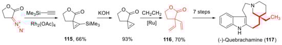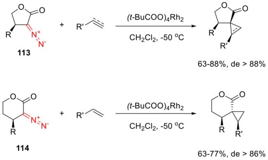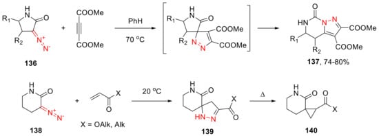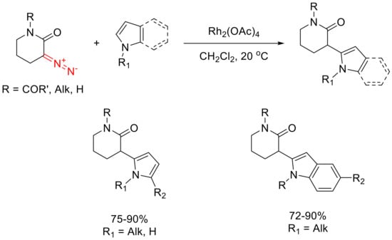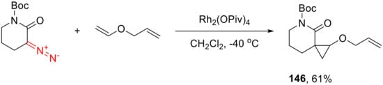 - Bonderoff, S.A.; Padwa, A. Rhodium(II) Catalyzed Cyclopropanation/Cycloaddition Reactions of the Bis(Diazo)Piperidin-2-One System. Tetrahedron Lett. 2015, 56, 3127–3129. [Google Scholar] [CrossRef]