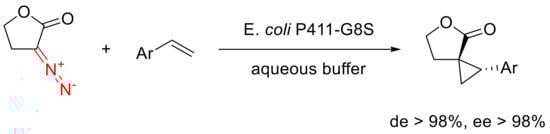 - Zhang, R.K.; Chen, K.; Huang, X.; Wohlschlager, L.; Renata, H.; Arnold, F.H. Enzymatic Assembly of Carbon–Carbon Bonds via Iron-Catalysed Sp3 C–H Functionalization. Nature 2019, 565, 67–72. [Google Scholar] [CrossRef]