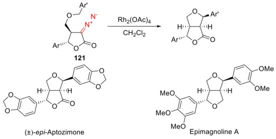 - Brown, R.C.D. Synthesis of Endo, Exo-Furofuranones Using a Highly Diastereoselective C–H Insertion Reaction. Chem. Commun. 1998, 17, 1895–1896. [Google Scholar] [CrossRef]