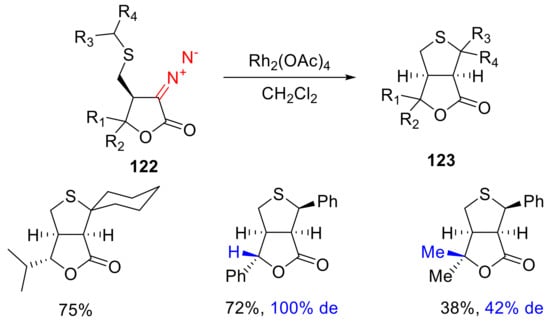 - Skerry, P.S.; Swain, N.A.; Harrowven, D.C.; Smyth, D.; Bruton, G.; Brown, R.C.D. Intramolecular C–H Insertions Adjacent to Sulfur for the Diastereoselective Synthesis of Thienofuranones. Chem. Commun. 2004, 1772–1773. [Google Scholar] [CrossRef]