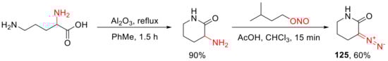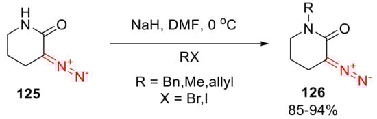 - Hutchinson, I.S.; Matlin, S.A.; Mete, A. The Synthesis and Chemistry of 3-Diazo-Piperidin-2-One. Tetrahedron 2002, 58, 3137–3143. [Google Scholar] [CrossRef]