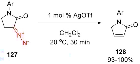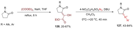 - Zhukovsky, D.; Dar’in, D.; Kantin, G.; Krasavin, M. Synthetic Exploration of α-Diazo γ-Butyrolactams. Eur. J. Org. Chem. 2019, 2019, 2397–2400. [Google Scholar] [CrossRef]