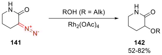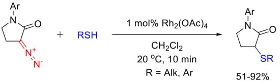 - Eremeyeva, M.; Zhukovsky, D.; Dar’in, D.; Krasavin, M. Preparation and in Situ Use of Unstable N-Alkyl α-Diazo-γ-Butyrolactams in Rh II -Catalyzed X–H Insertion Reactions. Beilstein J. Org. Chem. 2020, 16, 607–610. [Google Scholar] [CrossRef]