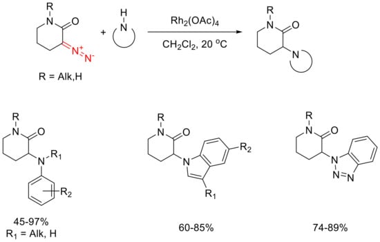 - Muthusamy, S.; Srinivasan, P. Facile Chemoselective Rhodium Carbenoid N–H Insertion Reactions: Synthesis of 3-Arylamino- or 3-Heteroarylpiperidin-2-Ones. Tetrahedron Lett. 2005, 46, 1063–1066. [Google Scholar] [CrossRef]