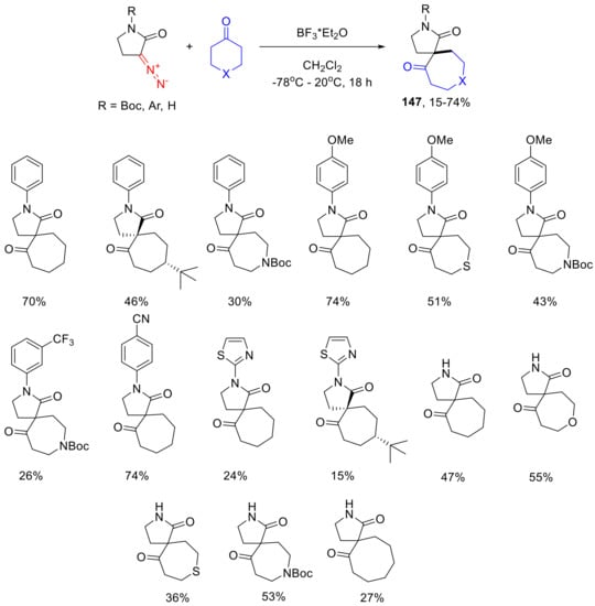 - Eremeyeva, M.; Zhukovsky, D.; Dar’in, D.; Krasavin, M. The Use of α-Diazo-γ-Butyrolactams in the Büchner–Curtius–Schlotterbeck Reaction of Cyclic Ketones Opens New Entry to Spirocyclic Pyrrolidones. Synlett 2020, 31, 982–986. [Google Scholar] [CrossRef]