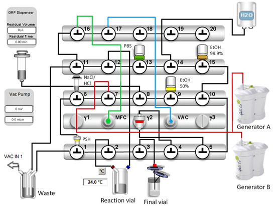 The configuration and setup of the synthesis module for the automated synthesis of [68Ga]Ga-DOTA-MGS8 is described in the Materials and Methods section (Section 4.2). The scheme of the synthesis module is shown in Figure 2.