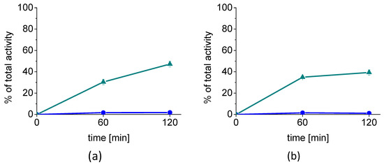 Cell internalization of [68Ga]Ga-DOTA-MGS8 in (a) A431-CCK2R cells and (b) AR42J cells after 1 and 2 h incubation (n = 3) (▲ internalized, ● membrane-bound).