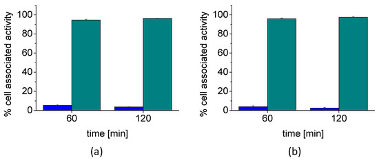 Distribution of the cell-associated radioactivity (internalized plus membrane-bound fraction) of [68Ga]Ga-DOTA-MGS8 in (a) A431-CCK2R cells and (b) AR42J cells after 1 and 2 h incubation (n = 3): membrane-bound (blue), internalized (cyan).