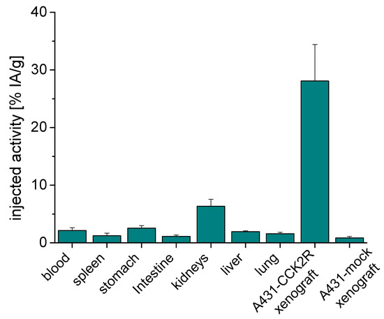 For the analyzed time point of 1 h p.i., the highest accumulation of radioactivity in non-tumor tissues was observed for kidneys with an uptake value of 6.36 ± 1.21% IA/g, as the main route of excretion at the early time point. A much lower uptake was observed in the liver (1.94 ± 0.13% IA/g) and intestine (1.12 ± 0.23% IA/g). Further hepatic clearance may occur at a later time point after injection. The radioactivity in blood was 2.06 ± 0.46% IA/g, and consequently, slightly elevated values were also observed for highly perfused organs such as the lung (1.58 ± 0.25% IA/g) and spleen (1.22 ± 0.45% IA/g). Increased levels of radioactivity were further observed in CCK2R expressing stomach (2.56 ± 0.41% IA/g) as well as the pancreas (1.03 ± 0.15% IA/g). In all other tissues, the uptake levels were below 1%. At dissection, a mean weight of 117.8 ± 52.8 mg (range from 62.0 to 189.3 mg) was found for A431-CCK2R tumor xenografts. A similar value was also observed for A431-mock tumors (125.4 ± 67.3 mg; range from 59.9 to 219.2 mg). A high level of radioactivity was found in A431-CCK2R tumor tissue with uptake values of 28.08 ± 6.35% IA/g, resulting in a tumor-to-kidney ratio of 4.41 ± 0.40, a tumor-to-stomach ratio of 11.03 ± 2.05 and tumor-to-blood ratio of 13.38 ± 1.77. A very low non-specific accumulation was observed in A431-mock xenografts (0.86 ± 0.22% IA/g). Figure 6 and Table S1 summarize the tumor and organ uptakes. In Table 3, the tumor-to-normal tissue ratios are given for selected tissues.
