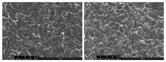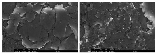 Initially, the surfaces of the prepared working electrodes were examined with a scanning electron microscope. In Figure 1, representative SEM images at low magnification of the graphene paste and clay paste coatings are presented. The surface texturing of both coatings is similar. Consecutive SEM images at high magnification are presented in Figure 2, demonstrating the surfaces in detail. Graphene paste exhibits a layered structure, mainly based on graphite plates. However, clay paste has a more heterogeneous structure, showing grains of clay deposited between the graphite plates. The even distribution of grains in the whole film is observed. The investigation of the chemical composition of each type of coatings was also performed with the use of the EDX method (presented in detail in the Supplementary Material). EDX results are in good agreement with data obtained from the WDXRF analysis.