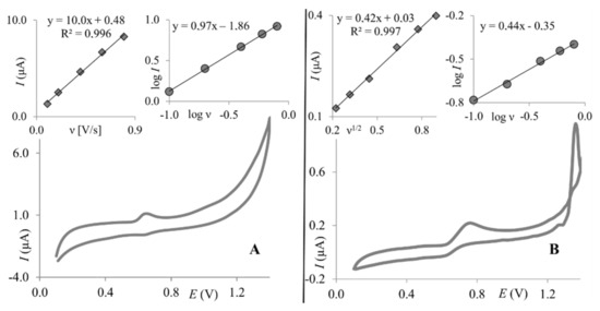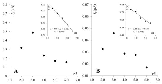 For the clay paste electrode, it was observed that the logarithm of the peak current is linearly proportional to the logarithm of the scan rate (slope = 0.97), indicating an adsorption-controlled electrode reaction (Figure 3A, right inset). This was confirmed by a linear correlation between the PA peak current and the scan rate (Figure 3A, left inset). For graphene paste, electrode adsorption was not observed as the PA peak current was linearly dependent on the square root of the scan rate (Figure 3B, left inset), and the dependence between the logarithm of the peak current and logarithm of the scan rate gave a slope of 0.44 (Figure 3B, right inset), which is close to a theoretical value of 0.5—characteristic for electrode reactions controlled by depolarizer diffusion. Observed differences are in good agreement with previous reports, where it was proven that the paracetamol electrode reaction is dependent on the working electrode surface and material [14,44]. Next, as supporting electrolyte composition may significantly affect the electrochemical behavior of electroactive compounds, the effect of supporting electrolyte pH on PA peak currents was investigated. For this purpose, BR buffers pH 2.0–10.0 were chosen. Similar behavior of paracetamol was observed for both working electrodes. The PA peak current increased with pH to reach the maximum at pH 3.0 on both electrodes and then decreased. At higher pH values (pH ≥ 7), neither the peak currents nor the peak potentials were stable, thus results obtained in pH 7 and higher were not taken into account in further data analyses. Dependences between the PA peak currents and pH of Britton–Robinson buffer obtained on both working electrodes are shown in Figure 4. Based on these dependencies, in order to obtain the highest PA response, BR buffer pH 3.0 was chosen as the optimum supporting electrolyte and used in further studies with both working electrodes. Together, with the peak current, the paracetamol peak potential was also checked, as it frequently is pH-dependent. The PA peak potentials shifted toward less positive values with an increase in the pH for both electrodes. Dependences between the paracetamol peak potentials and pH of the BR buffer were linear for ClPE and GrPE, and could be described using the following equations: Ep = −0.046 pH + 0.817, and Ep = −0.048 pH + 0.833, respectively (as can be seen in the inset of Figure 4).