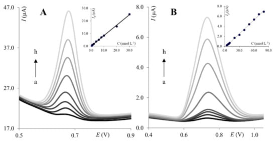 Voltammograms of PA recorded on the ClPE (A) and GrPE (B). (A): (a) 6.0 × 10−7 mol L−1, (b) 1.0 × 10−6 mol L−1, (c) 2.0 × 10−6 mol L−1, (d) 4.0 × 10−6 mol L−1, (e) 8.0 × 10−6 mol L−1, (f) 1.0 × 10−5 mol L−1, (g) 2.0 × 10−5 mol L−1, (h) 3.0 × 10−5 mol L−1; (B): (a) 4.0 × 10−6 mol L−1, (b) 6.0 ×10−6 mol L−1, (c) 8.0 × 10−6 mol L−1, (d) 1.0 × 10−5 mol L−1, (e) 2.0 × 10−5 mol L−1, (f) 4.0 × 10−5 mol L−1, (g) 6.0 × 10−5 mol L−1, (h) 8.0 × 10−5 mol L−1. Insets: Corresponding calibration curves.