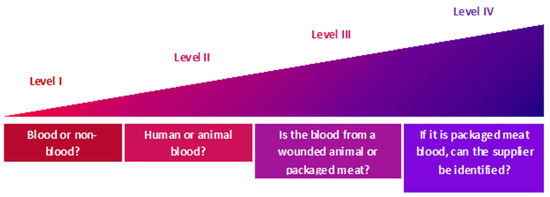 In a pre-validation study, Kennedy et al. [7] established the feasibility of MALDI MS-based methods to act as a confirmatory test, distinguishing between human and animal blood, down to species level (bovine, chicken and porcine), also confirming some of the markers detected by Lecrenier et al. [12]. In this study [7], animal blood was sourced from the (i) jugular vein, which in the present paper will be referred to as “intravenous”, and from (ii) packaged meat. An interesting observation was made in that for each of the selected animal species, the MALDI mass spectrum of the digested blood differed according to where the blood was sourced from, both in signal intensity and in terms of peptide profiles. Ultimately, mass spectral differences appeared to relate to the location from where blood was collected. For example, the mass spectral profile of intravenous blood was not superimposable to that of blood collected from the chest cavity of the animal. This occurrence led to the hypothesis that, in addition to the ability to detect blood and to differentiate between human and animal blood (down to animal species), it may also be possible to provide intelligence with respect to how the animal blood was generated at the crime scene through a specific panel of markers. The body of knowledge derived on animal blood detection and source discrimination from the Kennedy et al. work [7] has been adapted and integrated in a new “identification levels” schematic (Figure 1) hypothesising the potential to gain further insight surrounding the circumstances of animal bloodshed.