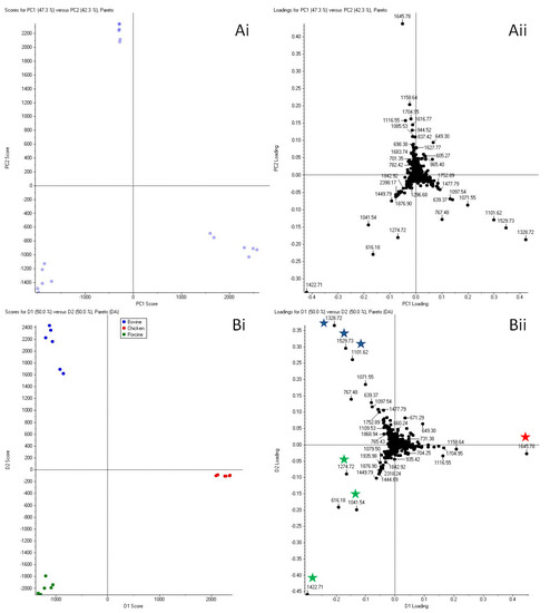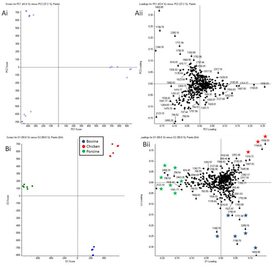PCA of bovine, chicken and porcine blood collected from the jugular vein of the animal versus bovine, chicken and porcine blood collected from packaged raw meat for each species (from the same five supermarkets). Six replicate spectra from each in solution animal blood proteolysis were used for the statistical analysis. (Ai,Bi) show the unsupervised and supervised PCA score plots whereas (Aii,Bii) the unsupervised and supervised loading plots, respectively, where (Bi,Bii) are the outputs of the PCA-DA.
