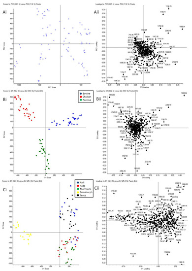 PCA plots of blood collected from packaged meat purchased from five different supermarkets are shown in Figure 6(Bi,Bii) groups. Some level of clustering can be observed for the blood from Morrison’s packaged bovine meat and for the blood from Aldi’s packaged bovine meat. However, whilst Morrison’s and Aldi’s can be distinguished from each other, they could be easily mistaken for Asda’s and Tesco’s, respectively. Bovine blood from Sainsbury’s packaged meat remains, in this analysis too, clearly distinguishable from the bovine blood deriving from other retailers in their corresponding packaged bovine meat. From these observations, it can be speculated that Sainsbury’s may have a different meat supplier and/or rely on different food processing. The same speculation can be made for Morrison’s and Aldi, although, from these analyses, they seem to share supplier/food processing with Asda and Tesco respectively.
