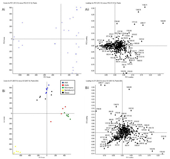 Principal component analysis of bovine blood collected from raw packaged meat (from five supermarkets in total: Asda, Aldi, Morrison’s, Tesco, and Sainsbury’s). Six replicate spectra from each in solution packaged bovine blood proteolysis were used for the statistical analysis. Panels (Ai,Aii) are the unsupervised PCA plots; Panels (Bi,Bii) are the supervised PCA-DA plots with blood provenance grouping based on supermarket of origin.