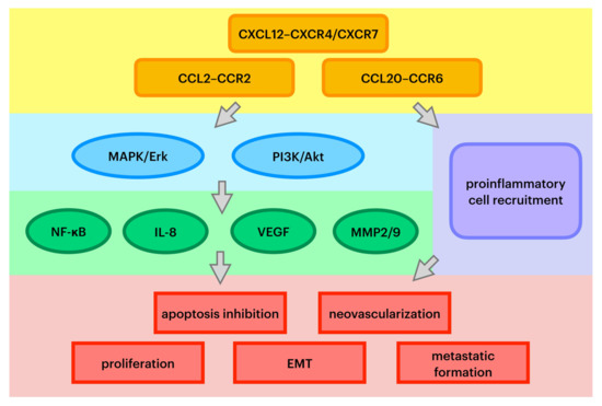 Chemokines are a family of small, secreted proteins with the ability to induce leukocyte influx to the site of infection. Chemokines exert an influence on cells by interacting with cell surface G protein-coupled heptahelical chemokine receptors [24]. Chemokines play a pivotal role in directing leukocyte migration and immune regulation. In pathological conditions, they also can be secreted and exert an impact on tumor stemlike cells and stromal cells [4,8]. Chemokines are also regarded as a prerequisite for diverse stages of cancer development. Recent studies have proven that there are alterations in chemokines and their receptor expression in some cancers caused by changes in activation of tumor suppressor genes or oncogenes. Precisely, these molecules play a prominent role in tumor growth by inhibiting cell apoptosis [24]. First of all, chemokines are involved in cancer cell aging and inducing cancer cell death. Second, it has been acknowledged that chemokines promote epithelial–mesenchymal transformation (EMT), the most pivotal alteration that initiates metastatic cascade [16]. Moreover, chemokines are presumed to play an important role in cancer-associated angiogenesis and the production of growth factors that trigger neovascularization [25]. Pathways of specific chemokines’ oncogenic influence are summarized in Figure 1.