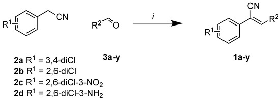 - Tarleton, M.; Gilbert, J.; Robertson, M.J.; McCluskey, A.; Sakoff, J.A. Library synthesis and cytotoxicity of a family of 2-phenylacrylonitriles and discovery of an estrogen dependent breast cancer lead compound. MedChemComm 2011, 2, 31–37. [Google Scholar] [CrossRef]