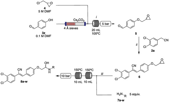 - Cossar, P.J.; Baker, J.; Cain, N.; McCluskey, A. In situ epoxide generation by dimethyldioxirane oxidation and the use of epichlorohydrin in the flow synthesis of a library of β-amino alcohols. R. Soc. Open Sci. 2018, 5, 171190. [Google Scholar] [CrossRef] [PubMed] [Green Version]