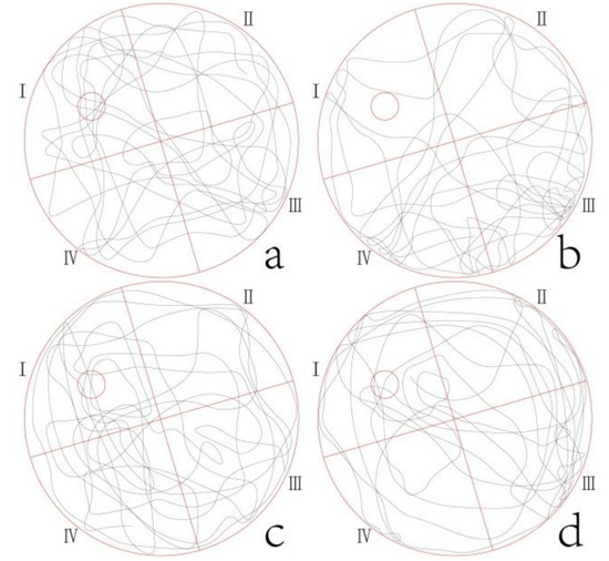Swimming trajectories of space exploration in normal group (a), model group (b), positive group (c), and peppermint essential oil group (d). The quadrant where the original platform was located was set as Ⅰ, and defined quadrants as Ⅱ, Ⅲ and Ⅳ clockwise in turn, with equal area of each quadrant.