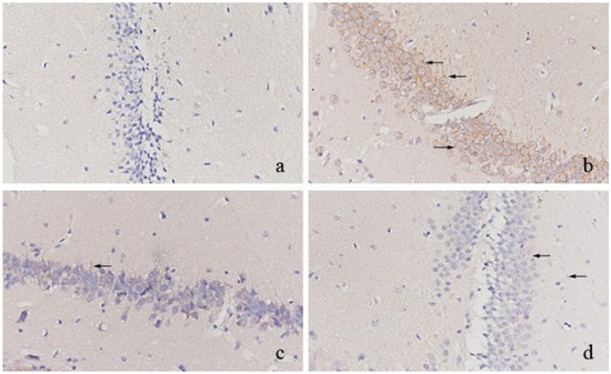 The results of immunohistochemical staining showed that the neurons in the normal group were closely arranged and that no obvious Aβ precipitation was observed (Figure 2a). The neurons were arranged in disorder, and the dark brown Aβ precipitation was observed near the neurons in the model group (Figure 2b). In the sections of the positive group (Figure 2c) and peppermint essential oil group (Figure 2d), the neurons were arranged in order, and Aβ precipitation near mouse brain neurons was significantly reduced; only a small number of Aβ precipitation was observed, and the precipitation colour was relatively light.